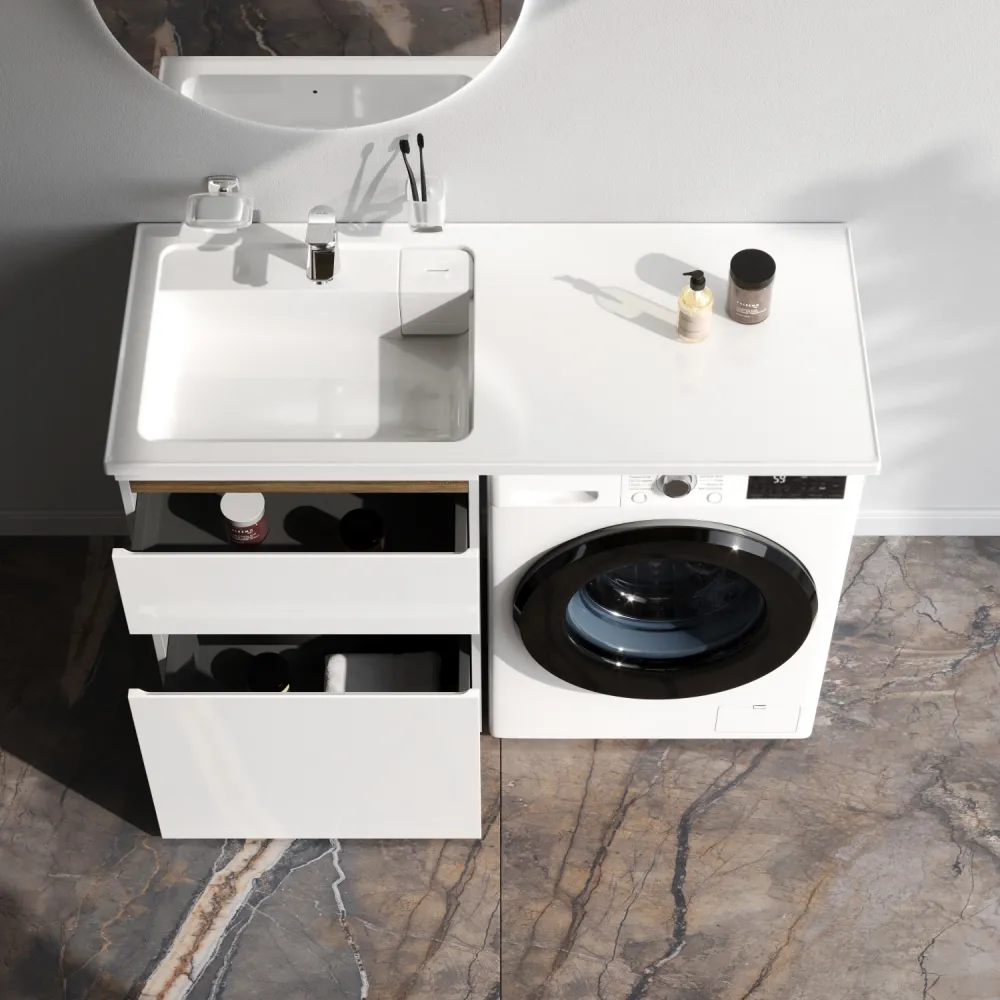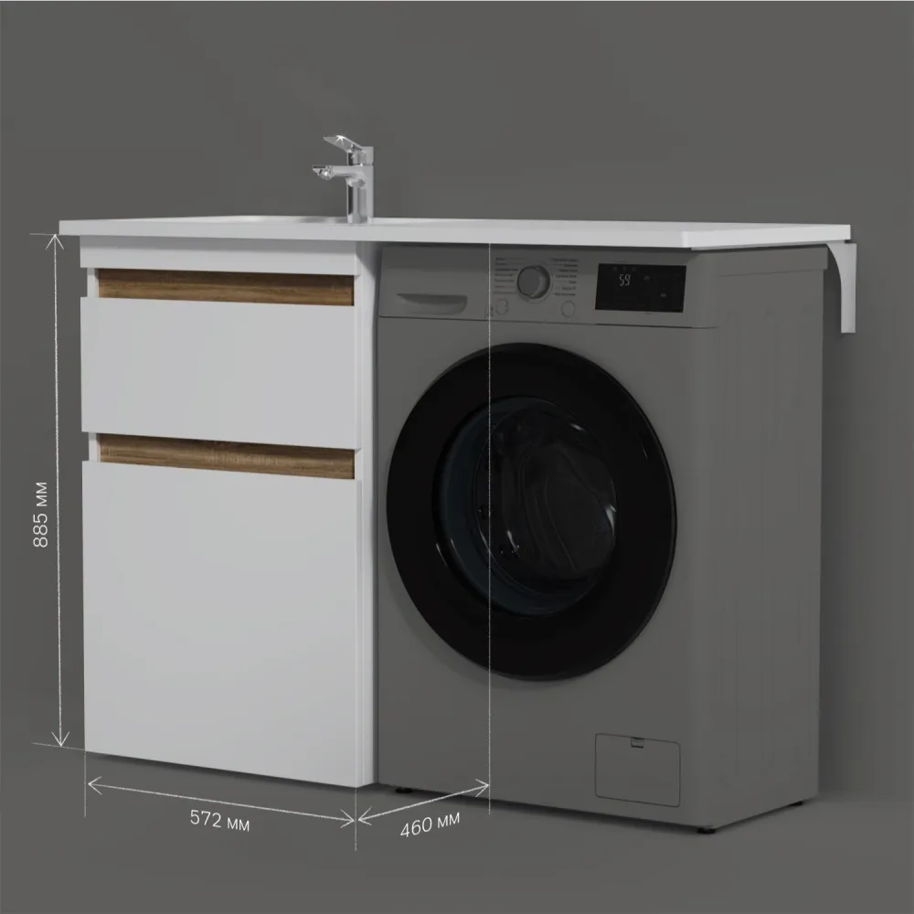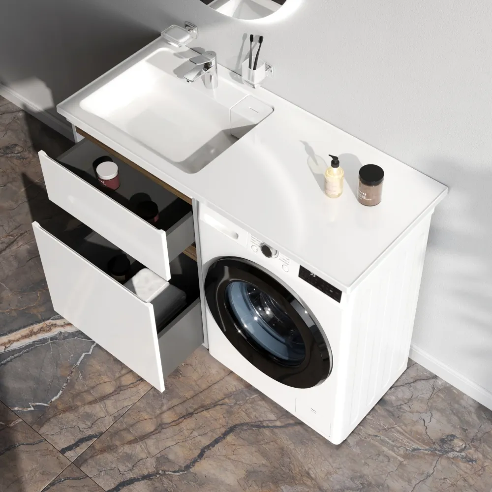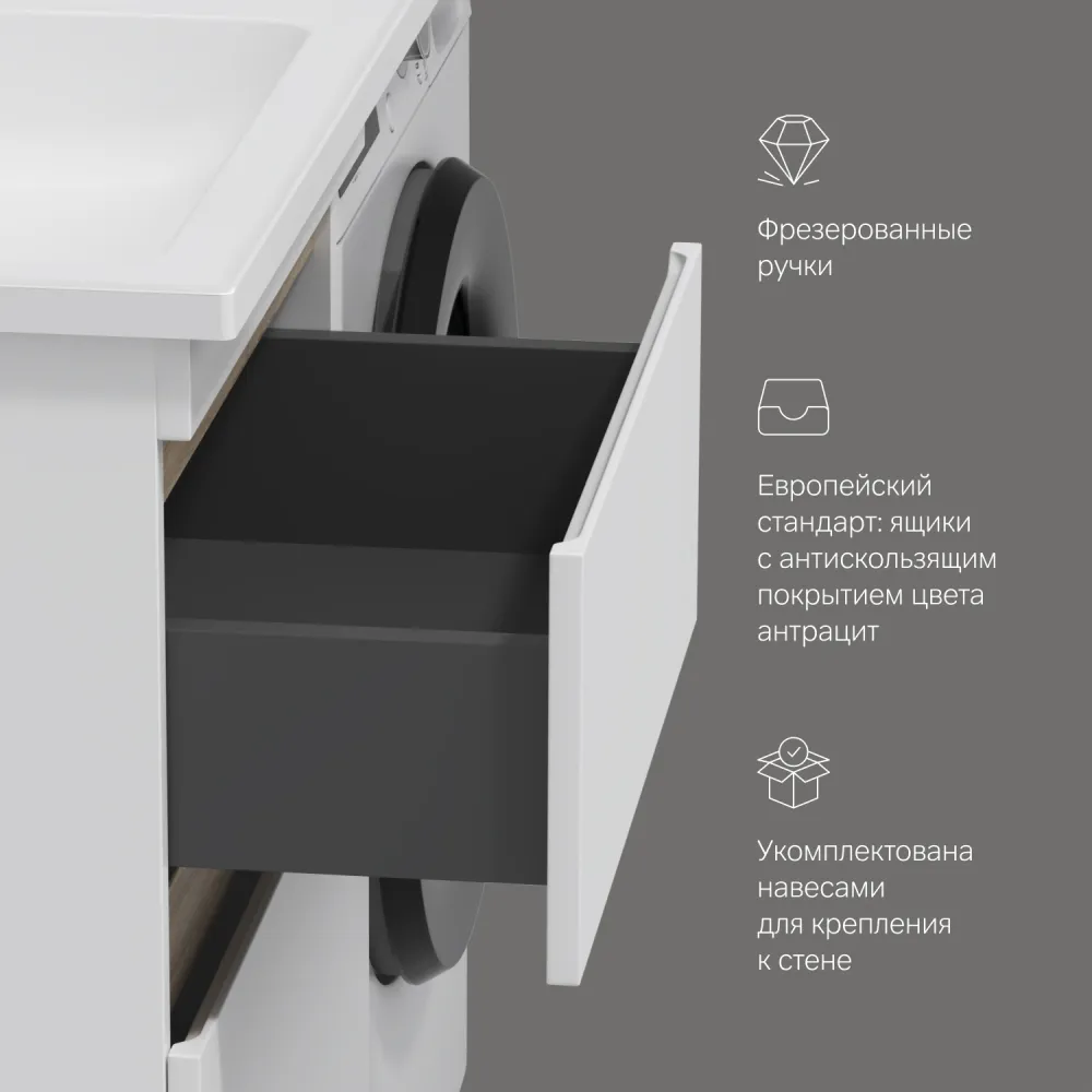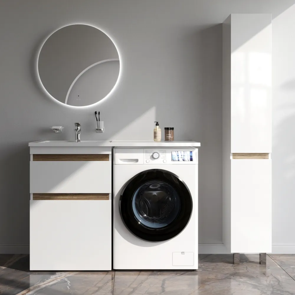 Долгожданное расширение в мебели X-Joy. Самое оптимальное и функциональное решение для организации пространства ванной комнаты с учетом размещения в ней стиральной машины. Подходит для интеграции с узкими стиральными машинами (глубиной от 32 до 45 см). Эстетичное сочетание цветов и фактур от дизайн-бюро Danelon Meroni (Великобритания & Италия): белые глянцевые фасады дополнены отделкой под светлое дерево.