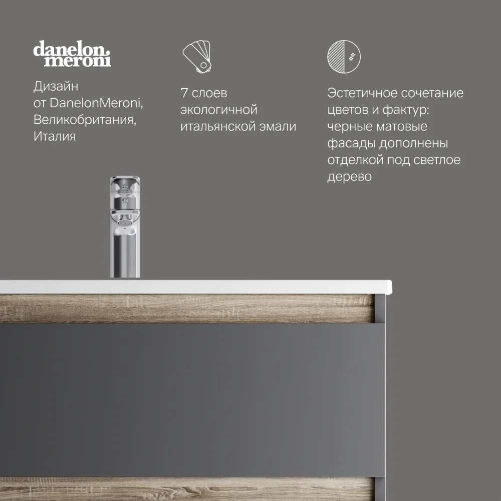 Впервые на рынке – дизайнерская коллекция сантехники которую может позволит себе каждый. Самое эстетичное сочетание цветов и фактур от дизайн-бюро Danelon Meroni (Великобритания & Италия): черные матовые фасады дополнены отделкой с фактурой под темное дерево.