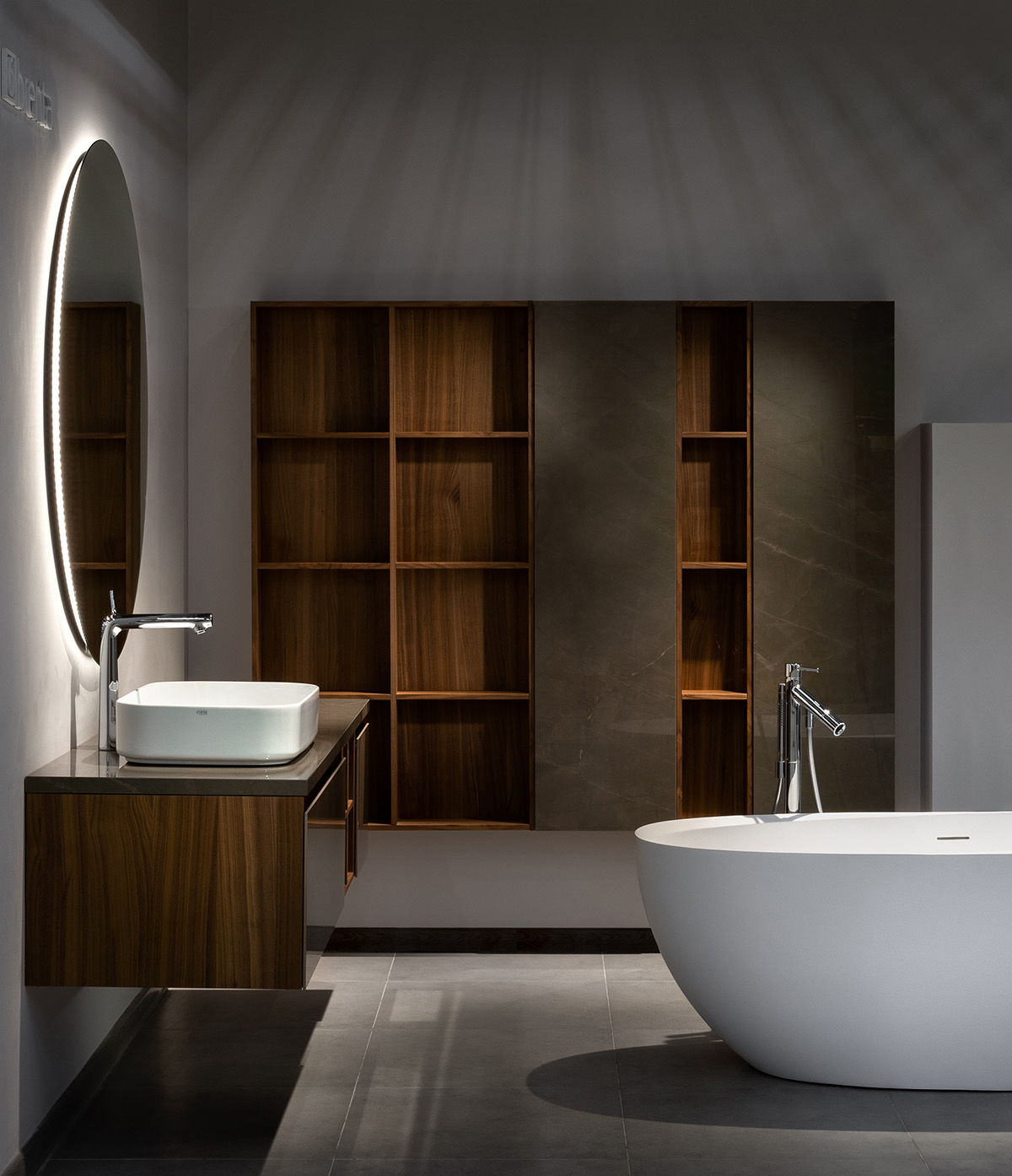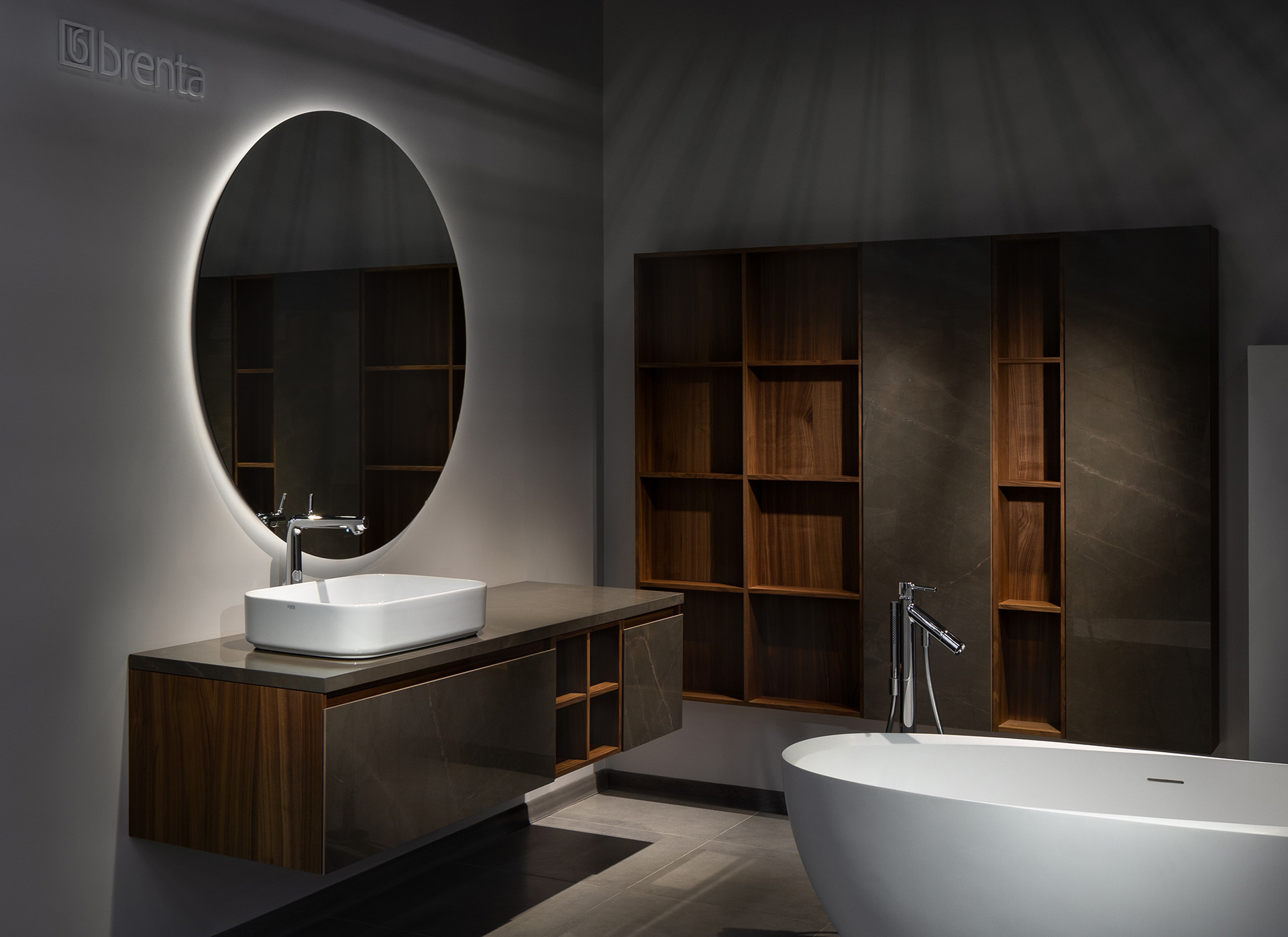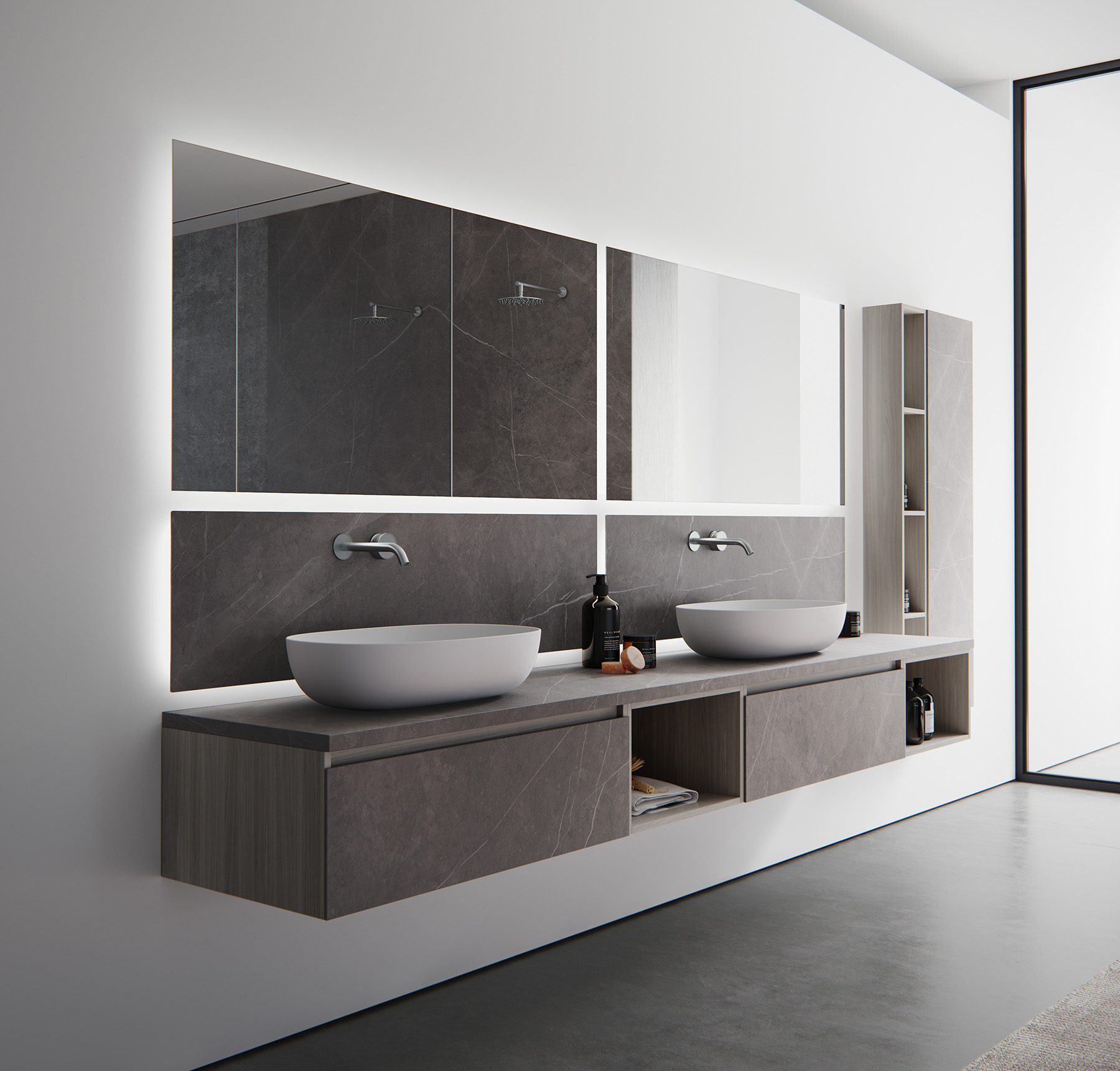 Kорпус тум6 и пеналов FUSION покрыты эмалью или отделаны натуральным шпоном. Столешницы и фасады из Итальянского керамогранита, с 6ольшым вы6ором матовых и глянцевых поверхностей.