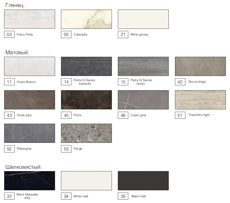 В конце артикула укажите тип и цвет отделки корпуса и цвет керамогранита для фасада