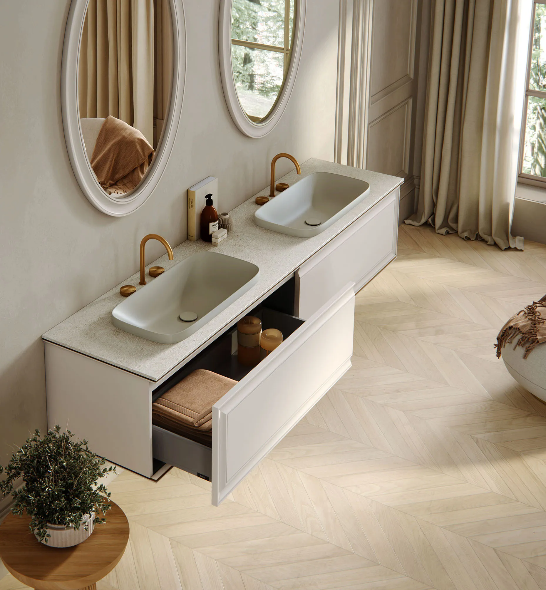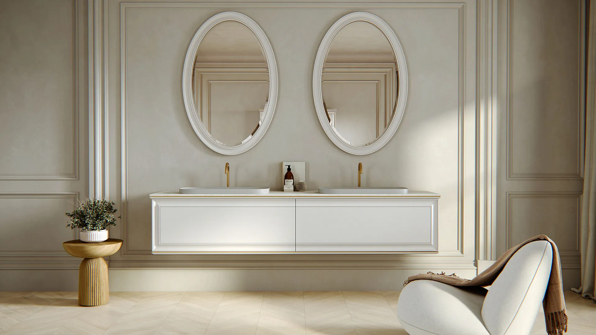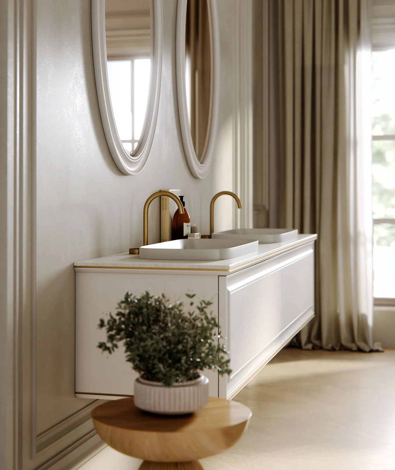 Коллекция LESTER - это прекрасный образец неоклассического стиля с высокой степенью проработки деталей. Наши дизайнеры решили отойти от стандартной классической композиции, внедрив в коллекцию уникальные элементы отделки. Они добавили изысканности в мебели и открыли новый необычный взгляд на неоклассический стиль. Основательность, практичность и консервативность основа на которой строиться современная классическая мебель. Особый шарм коллекции придает солидная, но в тоже время изящная столешница, выступающая за границы тумбы, отделанная полированной металлической вставкой по всему периметру. Аналогично выполнено и дно тумбы. Металлическая вставка может быть из полированной нержавеющей стали или исполнена в отделке под «золото». Простые, но в тоже время массивные фрезерованные фасады коллекции Lester – это немаловажная деталь классического стиля. Отличительной особенностью фасадов Lester является то, что фрезеровка рамки фасада выполнена по всей длине и высоте тумбы без разделения на отдельные ящики. Внешняя отделка: Внешние поверхности тум6 и пеналов LESTER о6лицованы матовой или глянцевой эмалью Фрезеровка рамки фасада выполнена по всей длине и высоте тум6ы, 6ез разделения на отдельные ящики . Hо периметру топа и дна тум6ы проходит металлическая вставка из полированной нержавеющей стали. Внутренняя отделка: Внутренние детали изготовлены из ламинированного влагостойкого МДФ класс влагостойкости E1. При заказе, по умолчанию внутренние детали выполнены в цвете «антрацит», возможен вариант в 6елом цвете. Комплектующие: Для комплектации изделий коллекции LESTER используются фурнитура австрийской фа6рики BLUM Legrabox с функцией открывания PUSH-OPEN (Tip-On). Дополнительные опции: В виде дополнительной опций возможна внутренняя подсветка тумб. Возможна комплектация разделителями ящиков. K моделям LESTER высотой P43,2см возможно заказать скрытый внутренний ящик. По умолчанию цвет антрацит. Для расчета цены тумбы глубиной до P. 56 см к вышеуказанным ценам необходимо добавить 4%. В конце артикула укажите тип и цвет отделки При заказе подсветки, в конце артикула добавляйте - .F Изменение ширины ящиков/дверей не влияет на конечную цену изделия Изготовление по индивидуальным размерам Возможно изготовление всех моделей коллекции LESTER с изменением длины, высоты и глу6ины изделий по желанию заказчика. Крепеж: Все изделия коллекции LESTER комплектуются специальной фурнитурой для крепления к лю6ой капитальной поверхности 6етон, пено6лок, массив дерева, сами крепежные элементы (винты, саморезы) в комплект не входят. Kак это сделано коллекция LESTER: Возможен вариант комплекта Tум6ы с накладной раковиной и со столешницой - для заказа дополнительно нужно Столешница (Столешницы из керамогранита 0.6; 1.2 см; Столешницы Solid Cast 1.2 см; Столешницы Solid Surface 1.2 см; Столешницы МДФ 1 см), Раковина (раковина чаша керамическая, раковина встраиваемая сверху керамическая, раковина встраиваемая сверху из керамогранита) Возможен вариант комплекта Tум6ы с интегрированной раковиной и со столешницой - для заказа дополнительно нужно Столешница (Столешницы из керамогранита 0.6; 1.2 см; Столешницы Solid Cast 1.2 см; Столешницы Solid Surface 1.2 см), Раковина (интегрированная раковина из керамогранита: раковина встраиваемая снизу, керамическая; раковина встраиваемая снизу, Solid Surfase. Solid Surfase; интегрированная ракови
