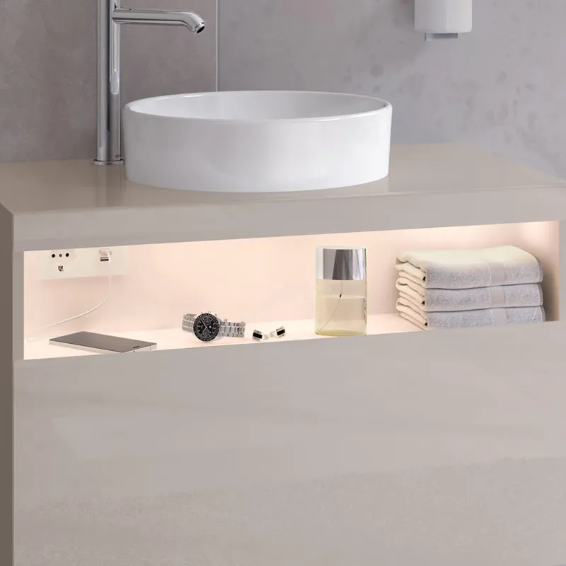 Эти покрытия обладают не только эстетическим эффектом, но и практическими преимуществами: устойчивость к пятнам и отпечаткам, лёгкость ухода, защита от влаги, долговечность. Это делает мебель Keuco привлекательным выбором даже для комнат с повышенной влажностью.