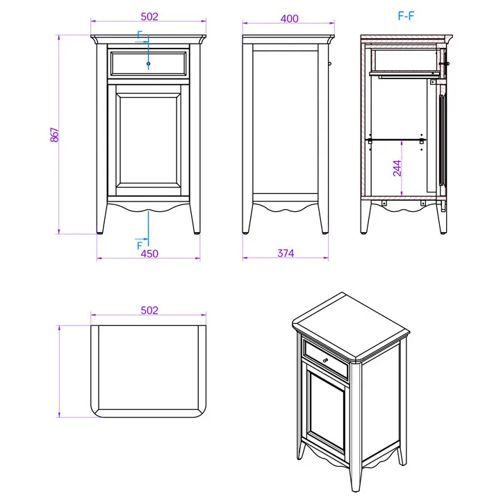 Тумба под раковину Tw Veronica 50.2/45x40/37.4xh86.7, 1 распашная дверка 1 выдвижной ящик, доводчики Blum, петли слева-SX,, bianco, ручки riflesso бронза VER2150S-B