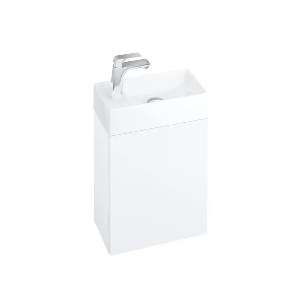 Керамический умывальник Veda и одноименная тумба белого цвета создают практичное компактное место для поддержания гигиены рук в туалетной комнате и ультрамалых ванных комнатах. Внутри тумбы можно скрыть, например, туалетные принадлежности.
