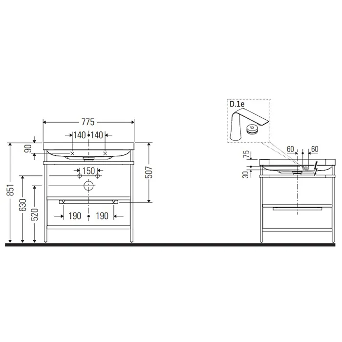 Duravit Happy D.2 Plus Консоль напольная с умывальником 775х490х850 мм, с 1 отв под смесит, 1 ящик, выпуск и сифон в комплекте, цвет белый глянцевый