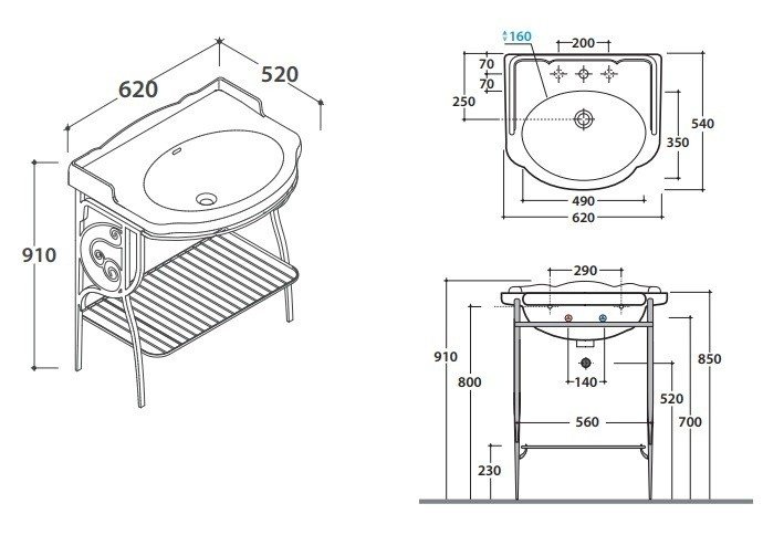 Консоль с раковиной напольная Globo Paestum 62х52см, на 3 отв., met.antico PA127 met.antico
