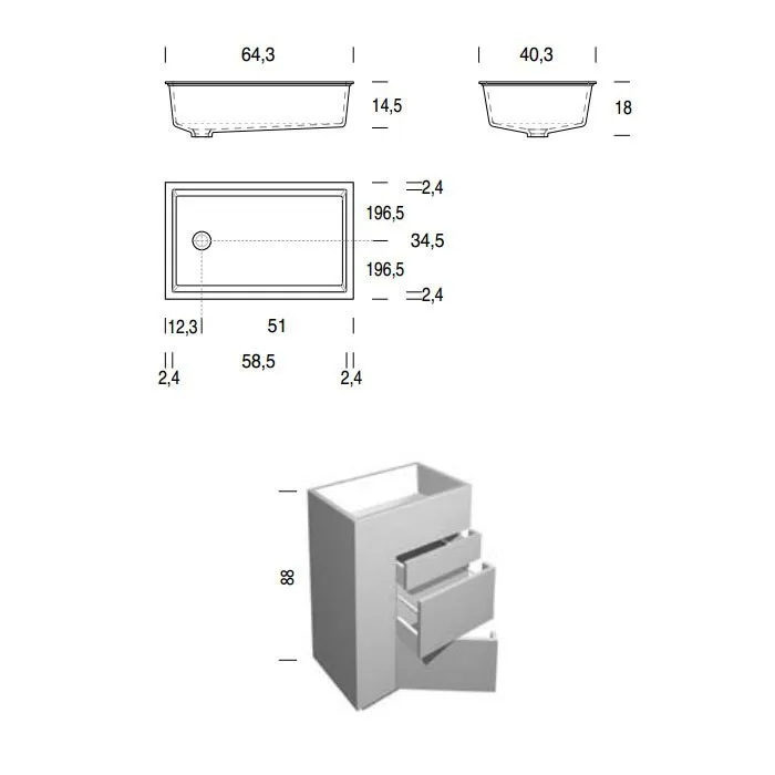 Тумба с раковиной Noorth Milldue Edition Touch 640х400х880, напольный, 3 ящика, слив в пол, раковина Milltek белая матовая, отделка Abete, 370893