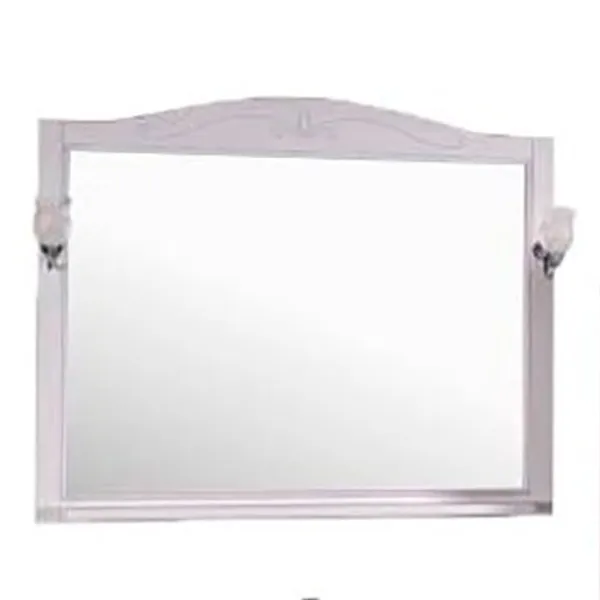 Зеркальное полотно влагостойкое, в раме из светлого дерева с полочкой и двумя светильниками.