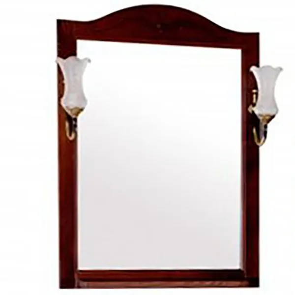 Зеркальное полотно влагостойкое, в раме из светлого дерева с полочкой и двумя светильниками.