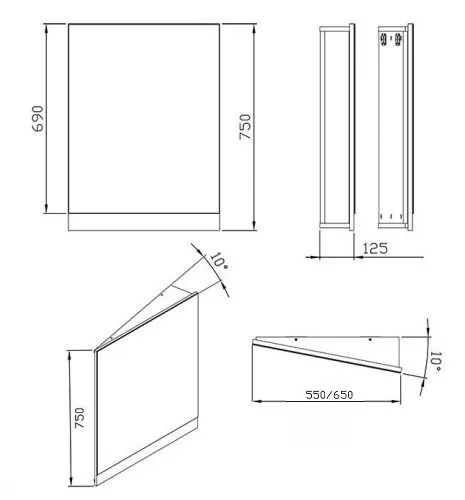 Для полного дизайнерского решения ванной комнаты рекомендуем угловое зеркало 10° комбинировать с остальными изделиями концепции 10° (угловым умывальником 10°, тумбой под угловой умывальник 10°, смесители 10° и другими аксессуарами для ванных комнат концепции 10°).
