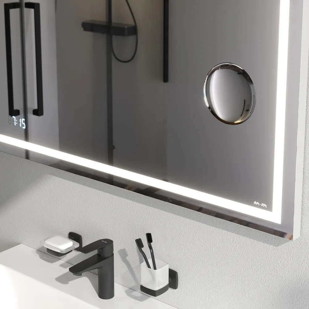 Ультрамодный лаконичный дизайн зеркал Gem от собственной студии дизайна AM.PM Design подойдет к интерьеру любой ванной комнаты. Премиальный функционал в коллекции доступного ценового сегмента: встроенное косметическое зеркало увеличивающее изображение и часы прямо под стеклом - всегда на виду.
