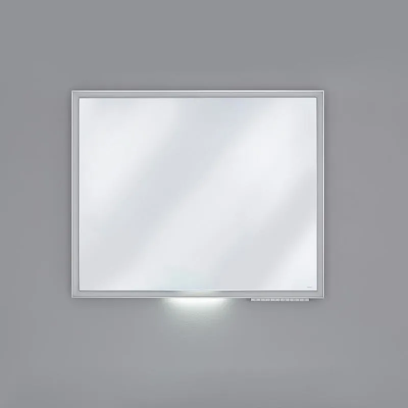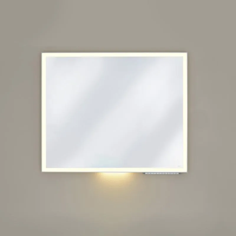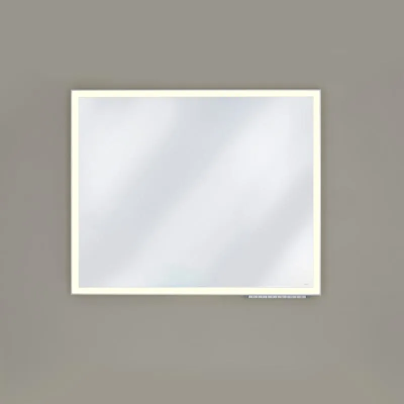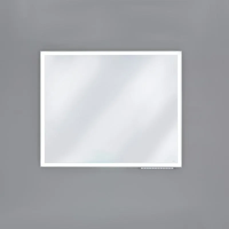 С подогревом зеркального полотна (по центру), бесступенчатая настройка тона подсветки от 2700 Кельвин (теплая белая) до 6500 Кельвин (дневной свет), обрамление из алюминия.