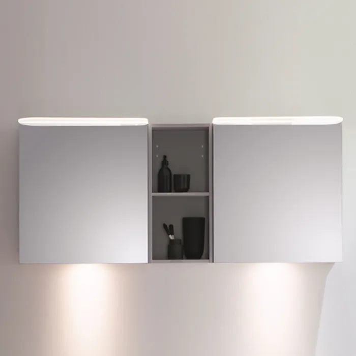 BurgBad Badu Зеркальный шкаф 150х31х66.5см, 2 светильника,2 выкл, 2 зерк двери, стойка с 1 полкой, стекл полки, подсветка мойки, цвет: лен серый. SFUE150K0521