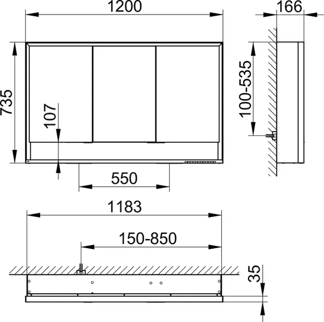 Для монтажа на стене, с подогревом, бесступенчатая настройка тона подсветки от 2700 Кельвин (теплая белая) до 6500 Кельвин (дневной свет), 3 поворотные дверцы с двусторонним озеркаливанием стекла, корпус из анодированного серебристого алюминия, задняя стенка зеркальная.