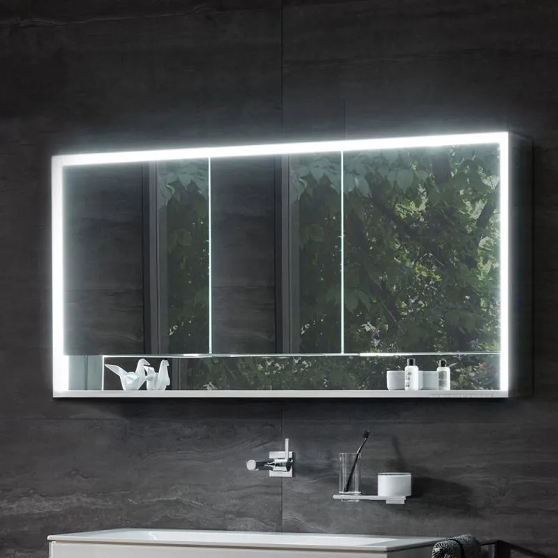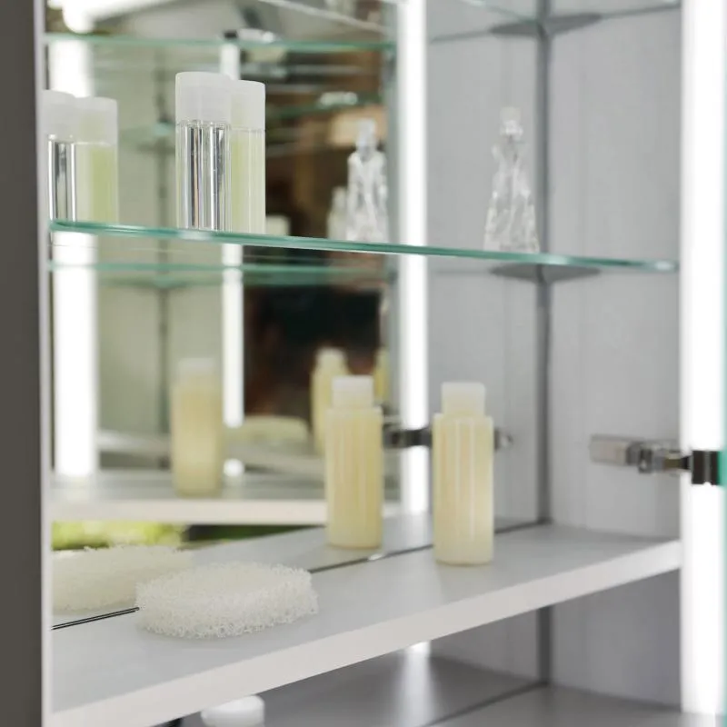 Для монтажа на стене, с подогревом, бесступенчатая настройка тона подсветки от 2700 Кельвин (теплая белая) до 6500 Кельвин (дневной свет), 3 поворотные дверцы с двусторонним озеркаливанием стекла, корпус из анодированного серебристого алюминия, задняя стенка зеркальная.