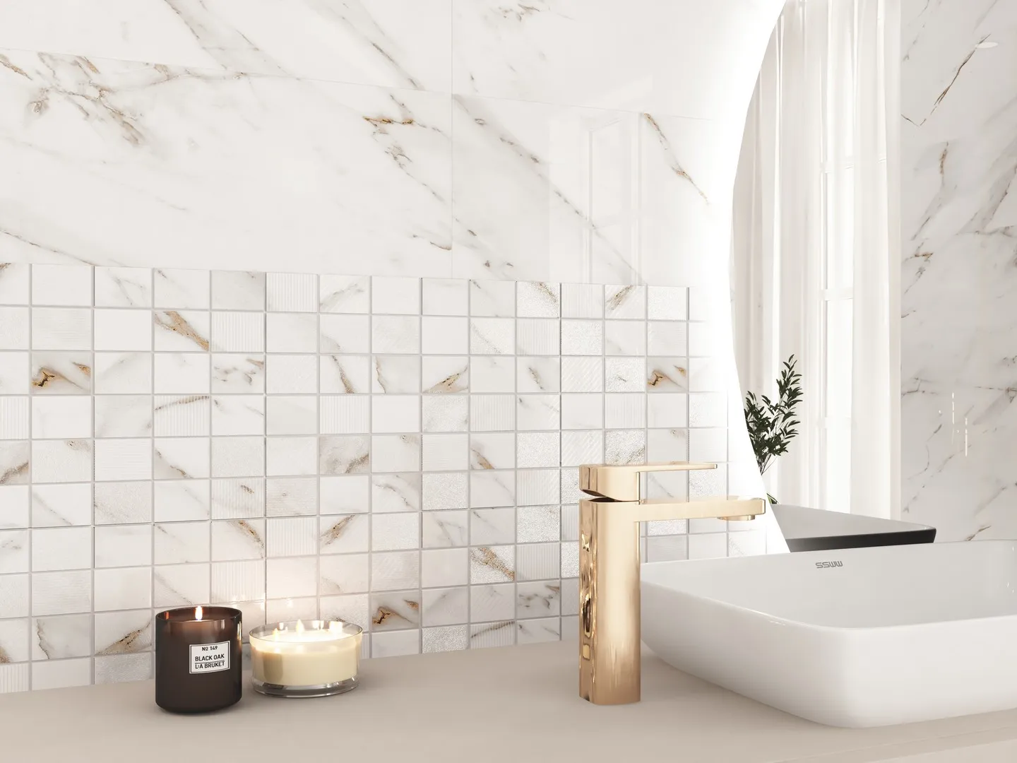 Благодаря своему глянцевому покрытию, плитка отражает свет, визуально расширяя пространство. А имитация мрамора придает интерьеру изысканность и элегантность.