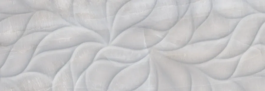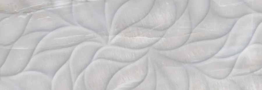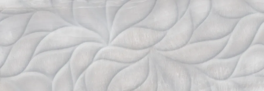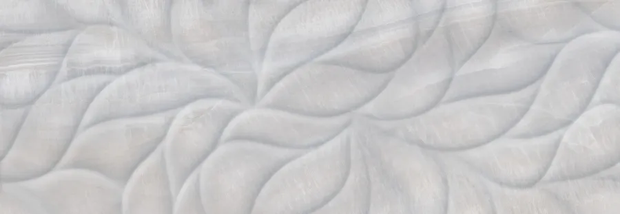 Плитка имеет серый цвет и структуру, имитирующую флористические элементы, что придаёт ей современный и стильный вид. Благодаря глянцевой поверхности плитка создаёт эффект блеска и добавляет интерьеру особую изысканность.