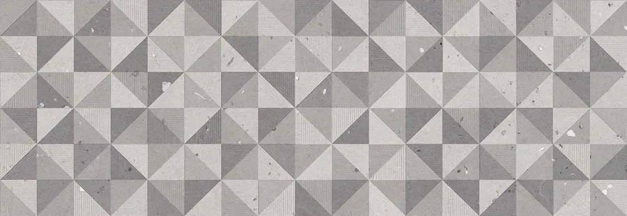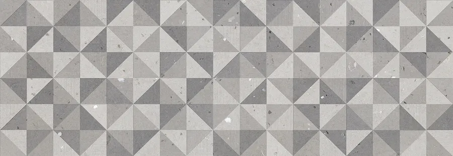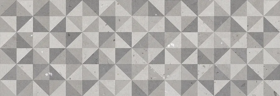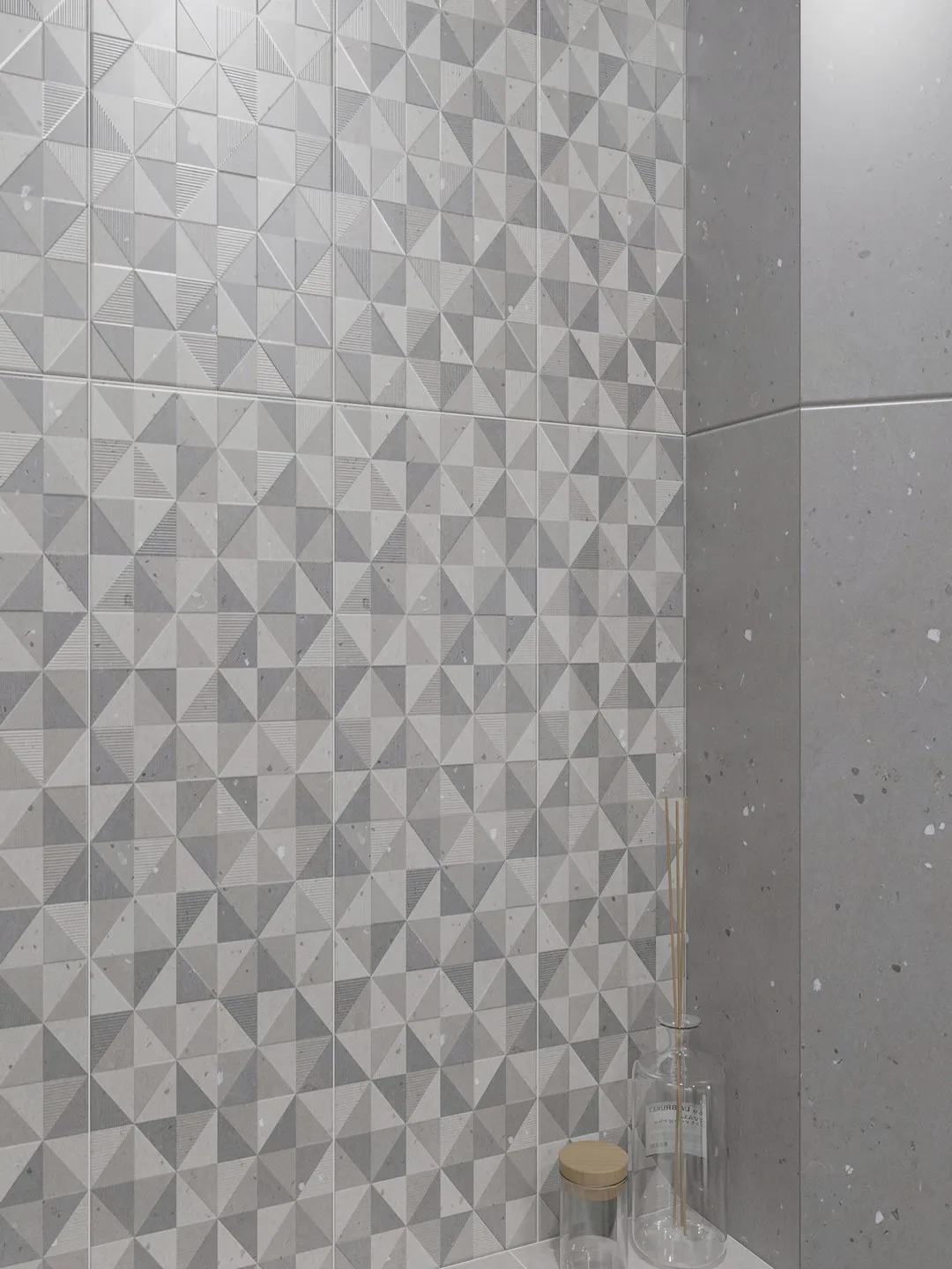 Плитка имеет геометрический декор в серых тонах, что позволяет гармонично вписать её в различные стилистические решения. Прямоугольная форма и матовая поверхность придают плитке современный вид.