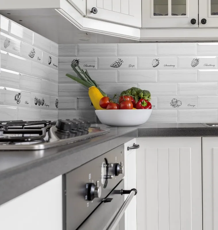 размера 10x30, белого цвета. Данный вид плитки, с рисунком в виде текста,