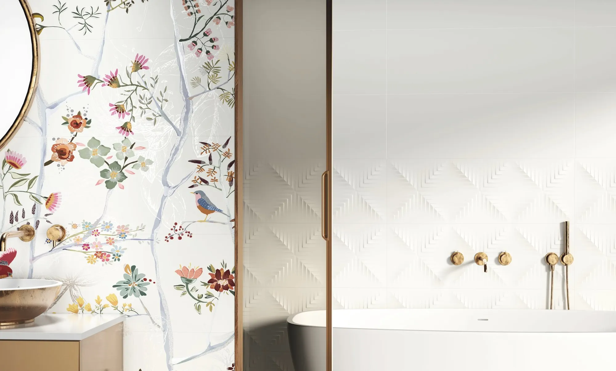 размера 126.4x90, белого цвета. Данный вид плитки, с цветочным рисунком,
