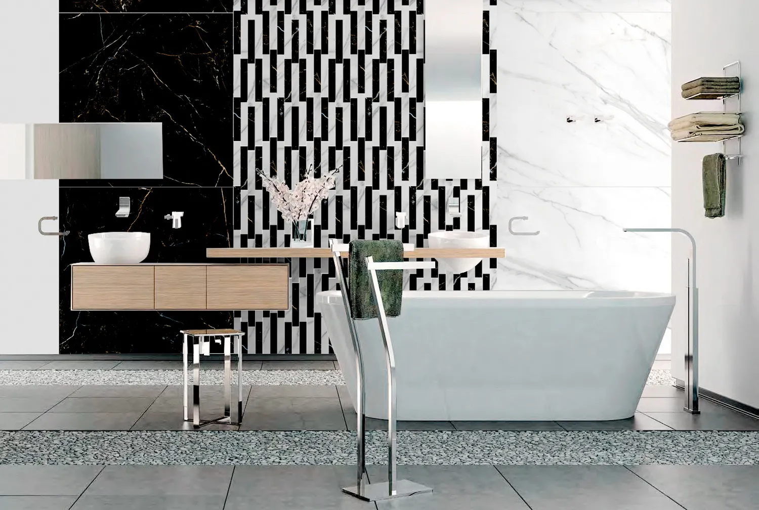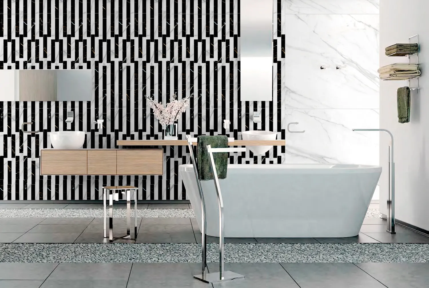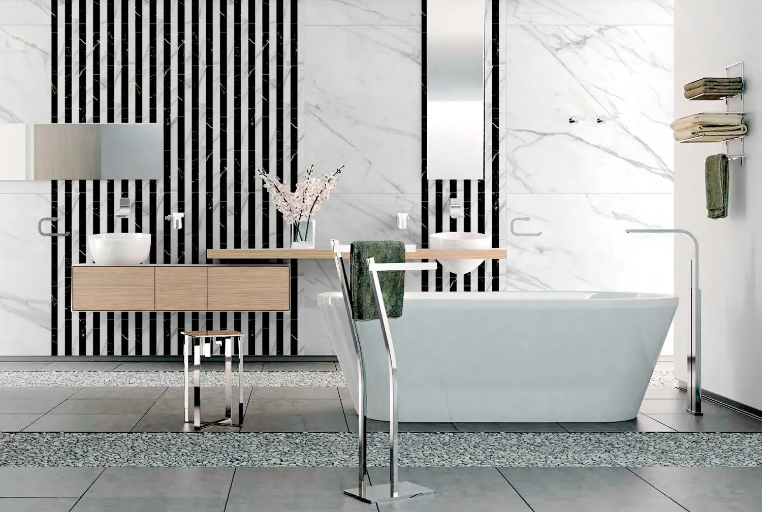 размера 30x90, белого цвета. Данный вид плитки, имитирующий камень,