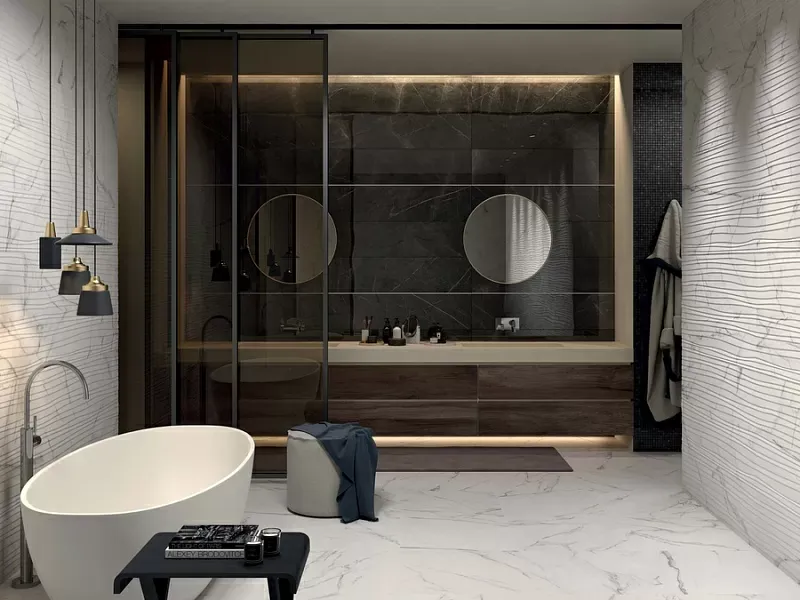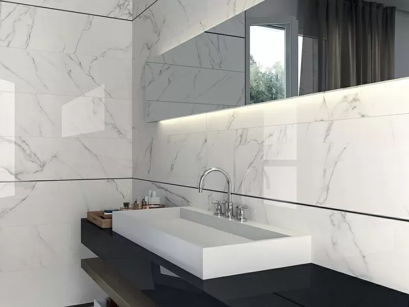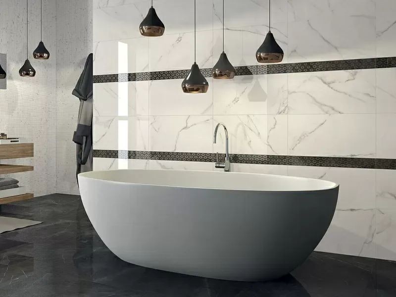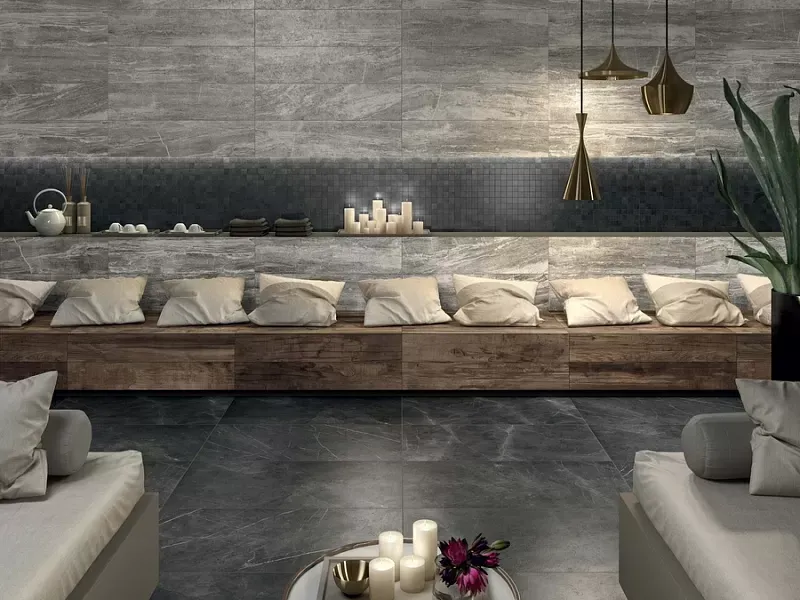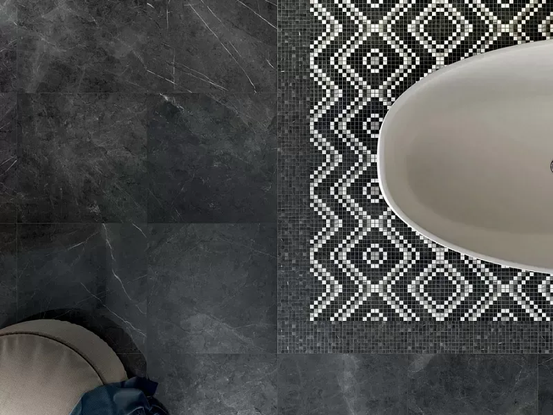 Итальянский, полированные керамогранит 1SL34200 SENSI PIETRA GREY LUX+ RET 60X120 прямоугольной формы, размера 120x60, чёрного цвета. Данный вид керамогранита, имитирующий камень, подойдет для пола Вашей ванной.