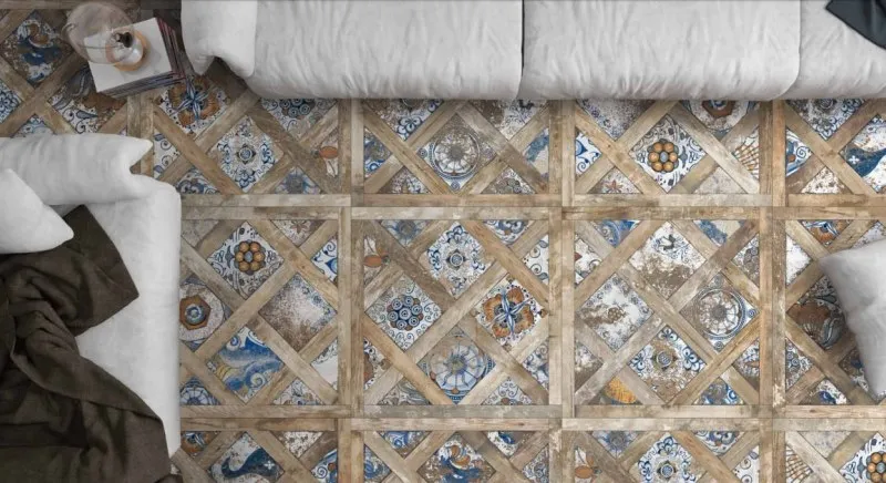 размера 80x80, бежевого цвета. Данный вид керамогранита, имитирующий деревянный паркет,
