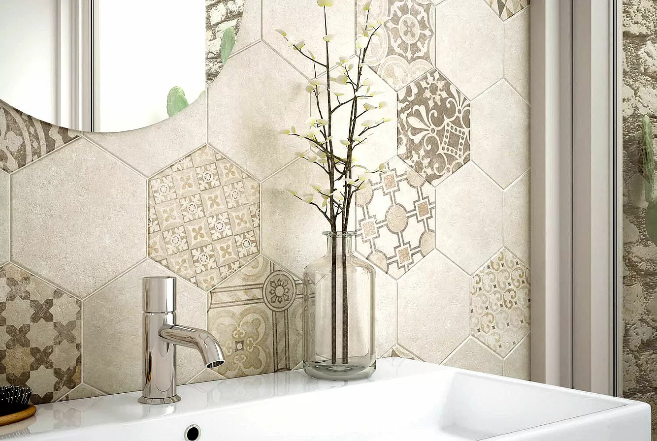 Испанский, натуральный керамогранит 22096 Hexatile Cement Mink 17,5x20 шестигранной формы, размера 17.5x20, бежевого цвета. Данный вид керамогранита, имитирующий бетон, подойдет для пола Вашей ванной.