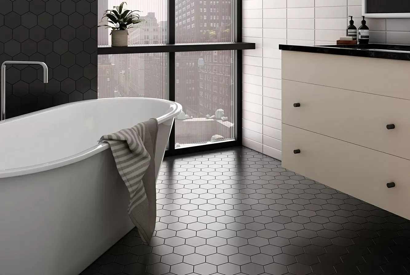 Испанский, глазурованный матовый керамогранит 26469 KROMATIKA Naval Blue 11,6x10,1 шестигранной формы, размера 11.6x10.1, синего цвета. Данный вид керамогранита, одноцветной, подойдет для пола Вашей ванной.