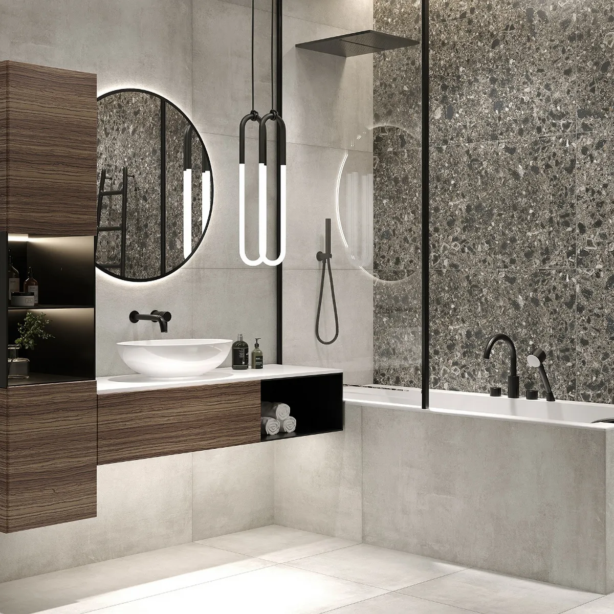 Цвет керамогранита — серый, оттенок — под бетон. Это универсальный цвет, который легко сочетается с различными стилями интерьера.