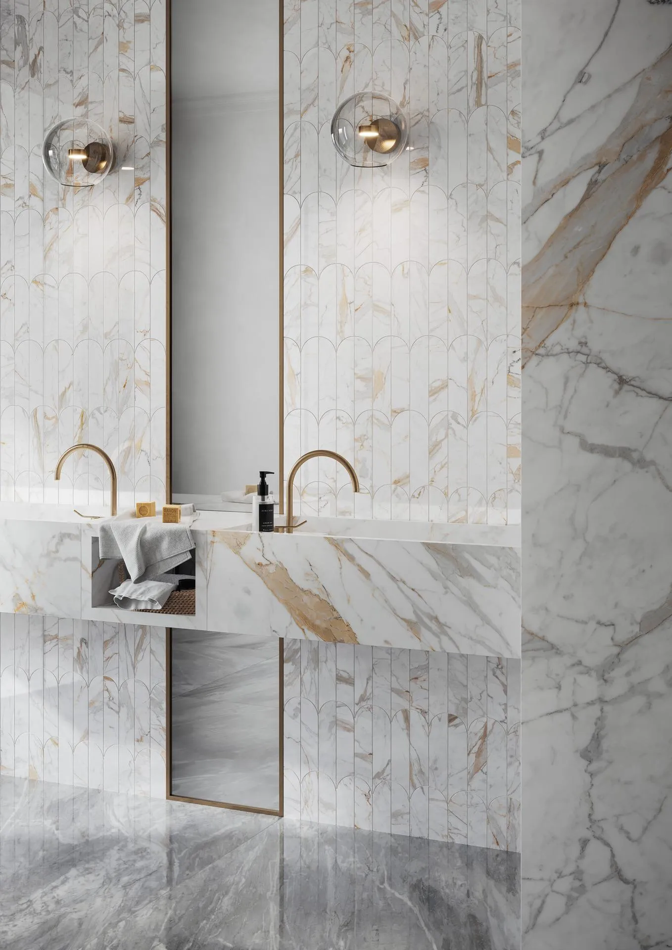 Итальянский, полированные керамогранит Incanto Calacatta Michelangelo Glossy 75*150 прямоугольной формы,