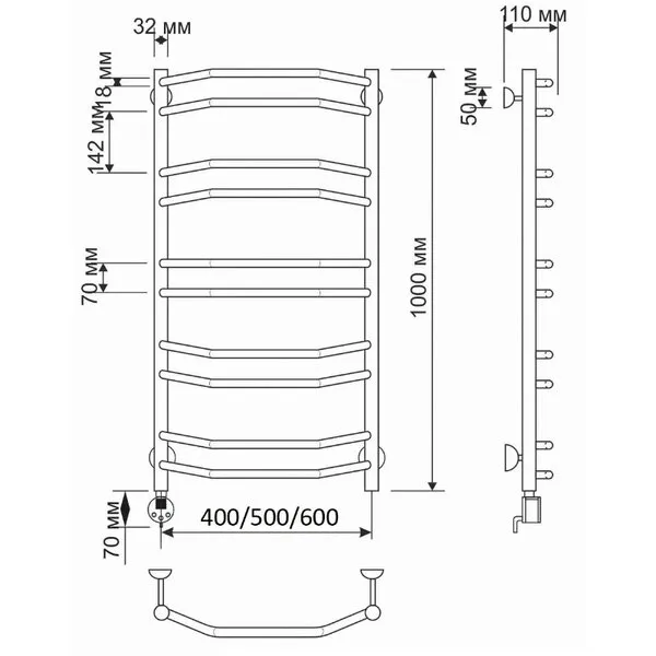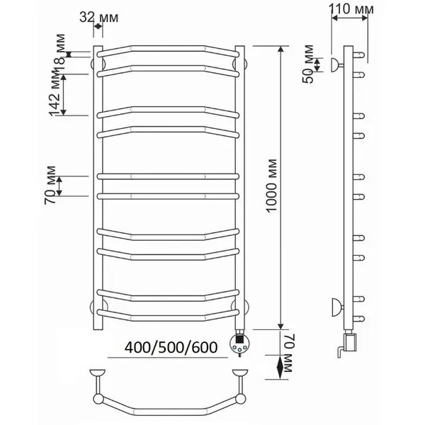 Электрический полотенцесушитель имеет выключатель на корпусе, встроенный терморегулятор, функцию отключения при нагреве для экономии энергии.