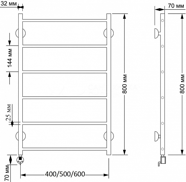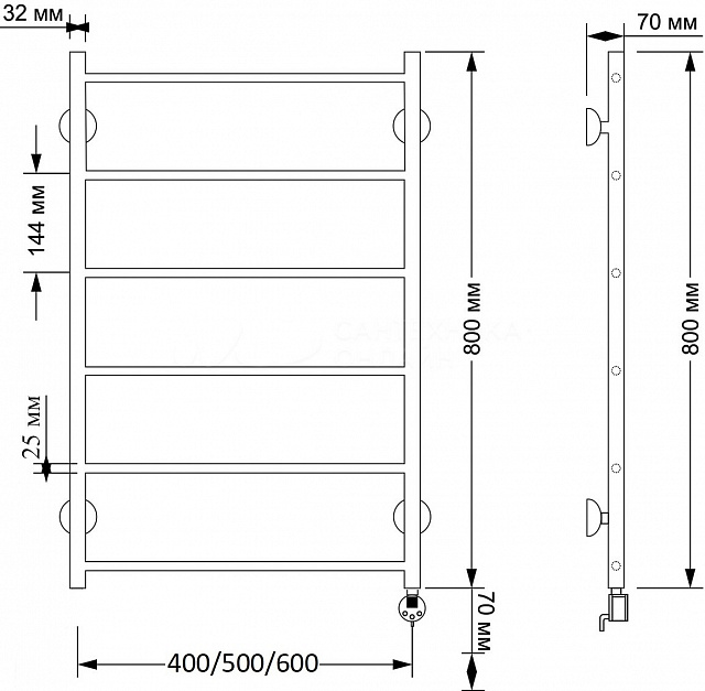 Электрический полотенцесушитель имеет выключатель на корпусе, встроенный терморегулятор, функцию отключения при нагреве для эконимии энергии.