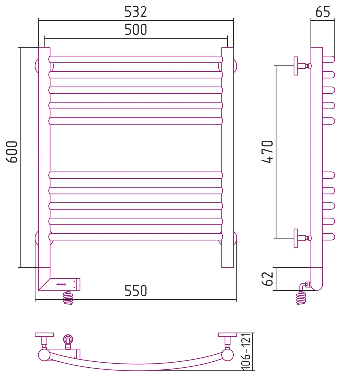 Технические характеристикиТип: Полотенцесушитель электрическийБренд: СунержаМодель: Богема 2.0Страна производителя: РоссияРазмер: 600х500Цвет: 00 Без покрытияРасположение МЭМа (блока управления): СлеваВнешние габариты - высота (мм): 600Внешние габариты - глубина min-max (мм): 106-121Внешние габариты - ширина (мм): 550Гарантия (лет): 2Мощность (W): 300Перемычка: ВыгнутаяТерморегулятор: Да
