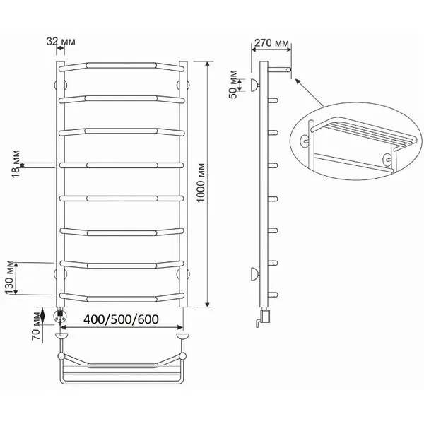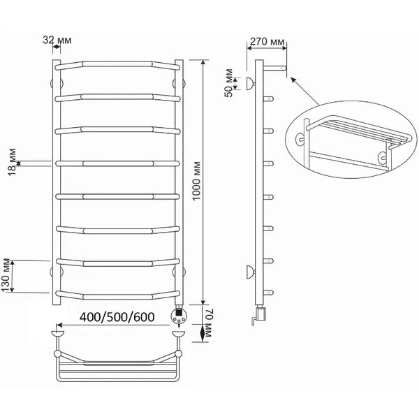 Электрический полотенцесушитель имеет выключатель на корпусе, встроенный терморегулятор, функцию отключения при нагреве для экономии энергии.