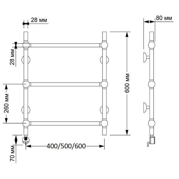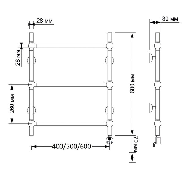 Электрический полотенцесушитель имеет выключатель на корпусе, встроенный терморегулятор, функцию отключения при нагреве для эконимии энергии.