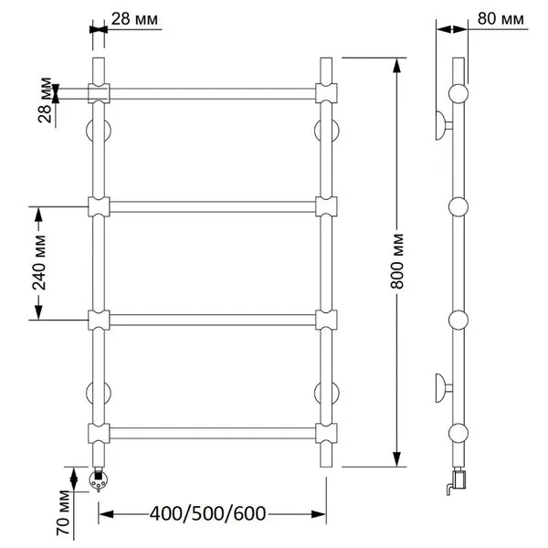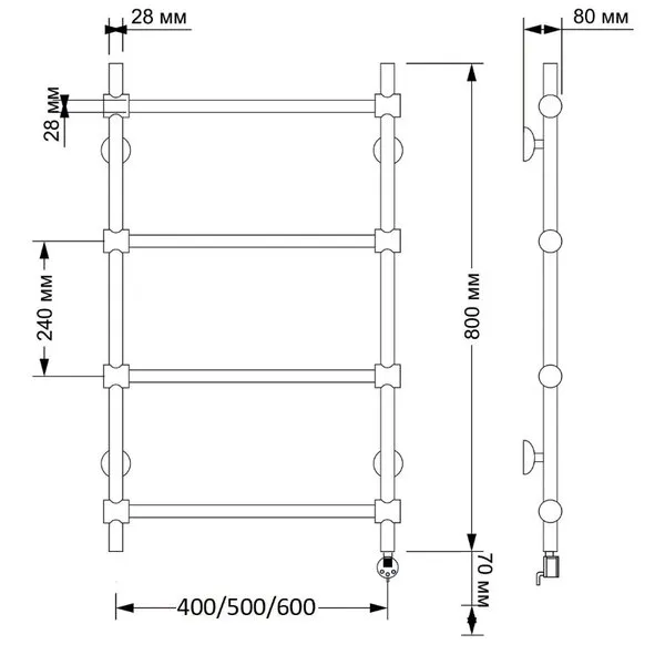 Электрический полотенцесушитель имеет выключатель на корпусе, встроенный терморегулятор, функцию отключения при нагреве для экономии энергии.
