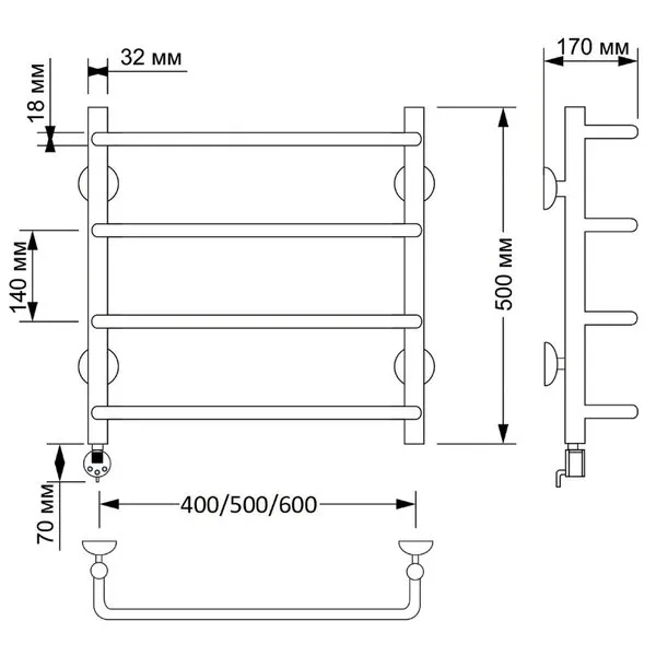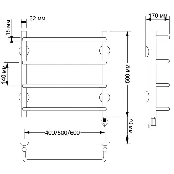 Электрический полотенцесушитель имеет выключатель на корпусе, встроенный терморегулятор, функцию отключения при нагреве для экономии энергии.