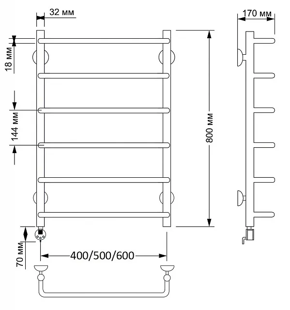 Электрический полотенцесушитель имеет выключатель на корпусе, встроенный терморегулятор, функцию отключения при нагреве для экономии энергии.
