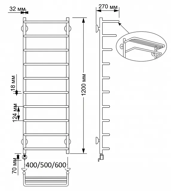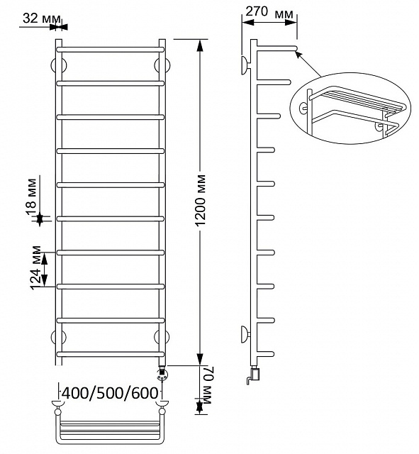 Электрический полотенцесушитель имеет выключатель на корпусе, встроенный терморегулятор, функцию отключения при нагреве для экономии энергии.