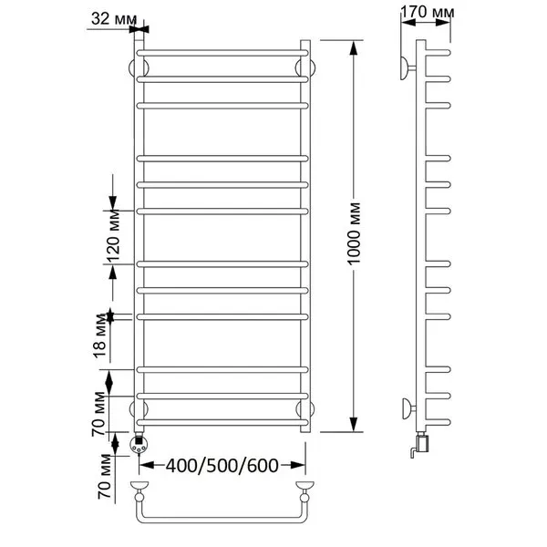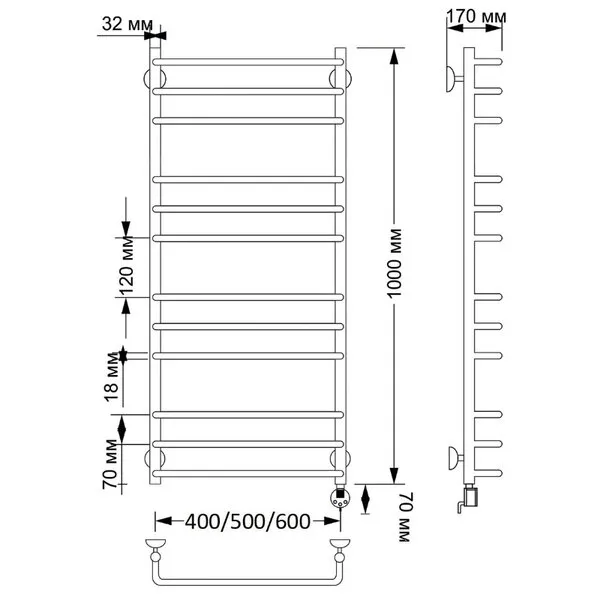 Электрический полотенцесушитель имеет выключатель на корпусе, встроенный терморегулятор, функцию отключения при нагреве для экономии энергии.