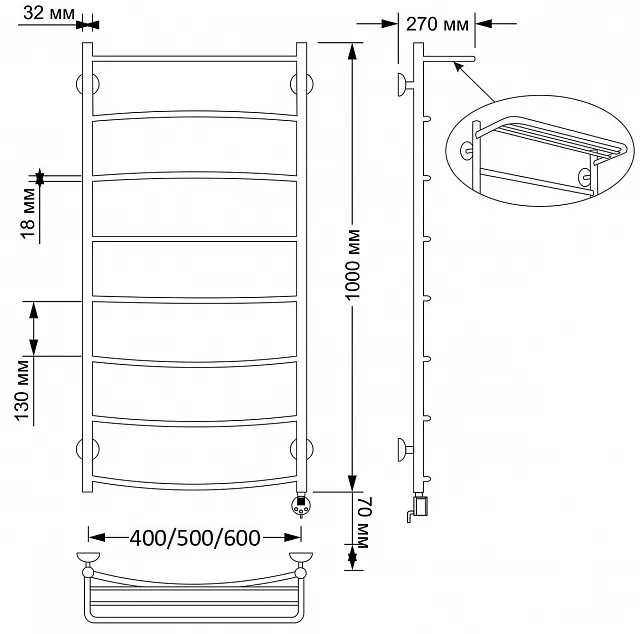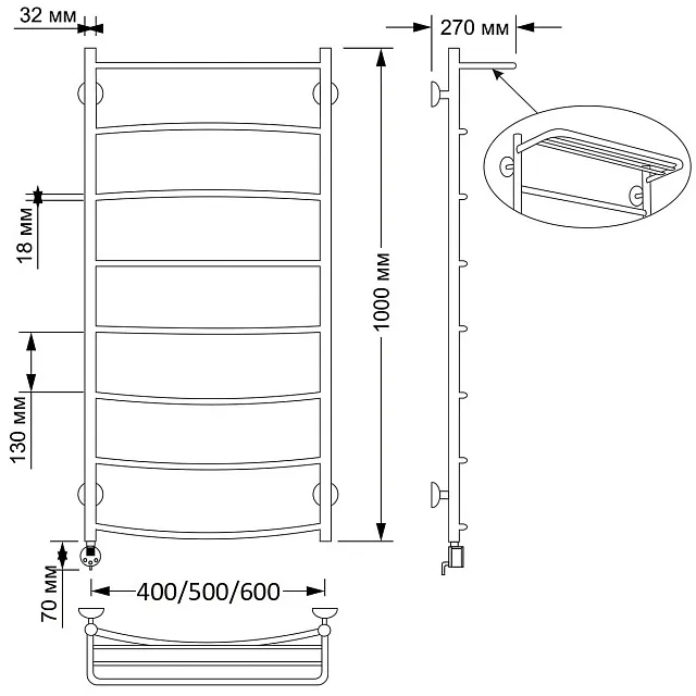 Электрический полотенцесушитель имеет выключатель на корпусе, встроенный терморегулятор, функцию отключения при нагреве для экономии энергии.