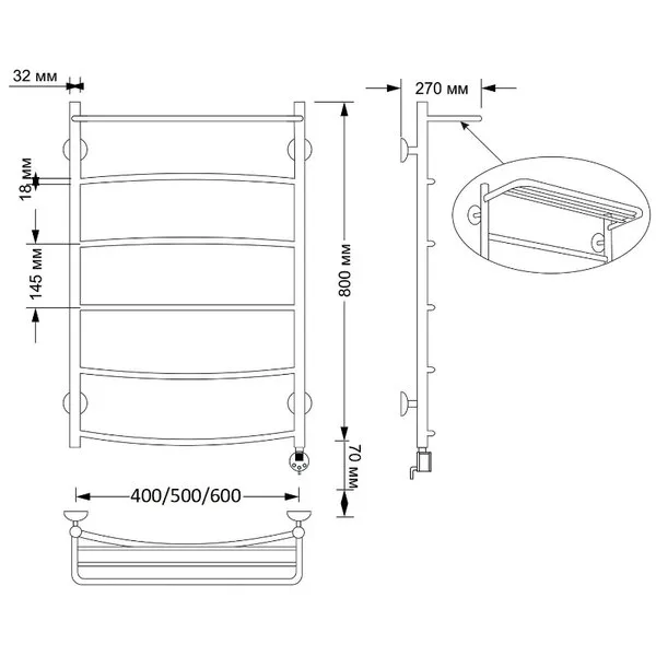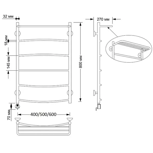 Электрический полотенцесушитель имеет выключатель на корпусе, встроенный терморегулятор, функцию отключения при нагреве для экономии энергии.
