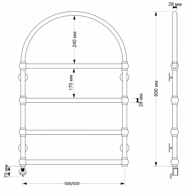 Электрический полотенцесушитель имеет выключатель на корпусе, встроенный терморегулятор, функцию отключения при нагреве для эконимии энергии.