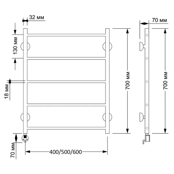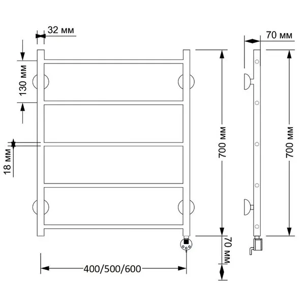 Электрический полотенцесушитель имеет выключатель на корпусе, встроенный терморегулятор, функцию отключения при нагреве для экономии энергии.