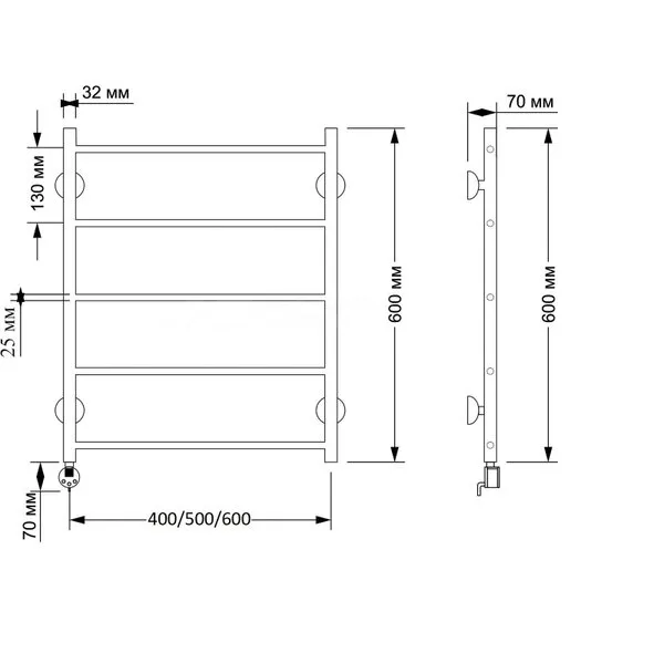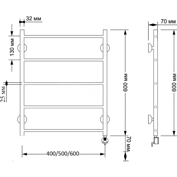 Электрический полотенцесушитель имеет выключатель на корпусе, встроенный терморегулятор, функцию отключения при нагреве для эконимии энергии.