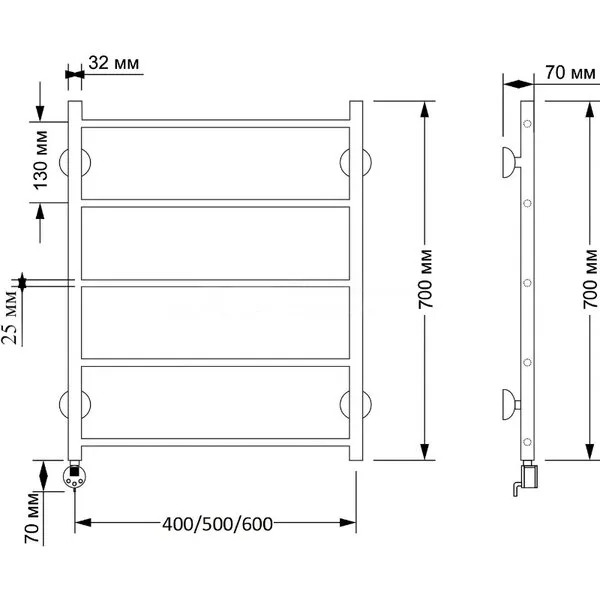 Электрический полотенцесушитель имеет выключатель на корпусе, встроенный терморегулятор, функцию отключения при нагреве для эконимии энергии.