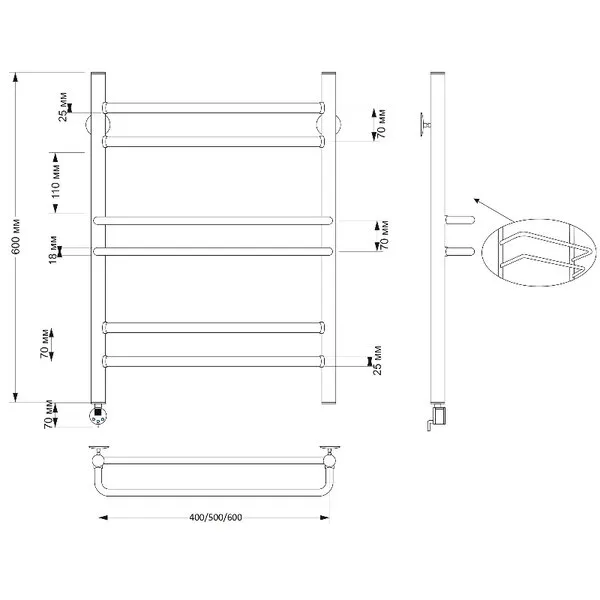 Электрический полотенцесушитель имеет выключатель на корпусе, встроенный терморегулятор, функцию отключения при нагреве для эконимии энергии.