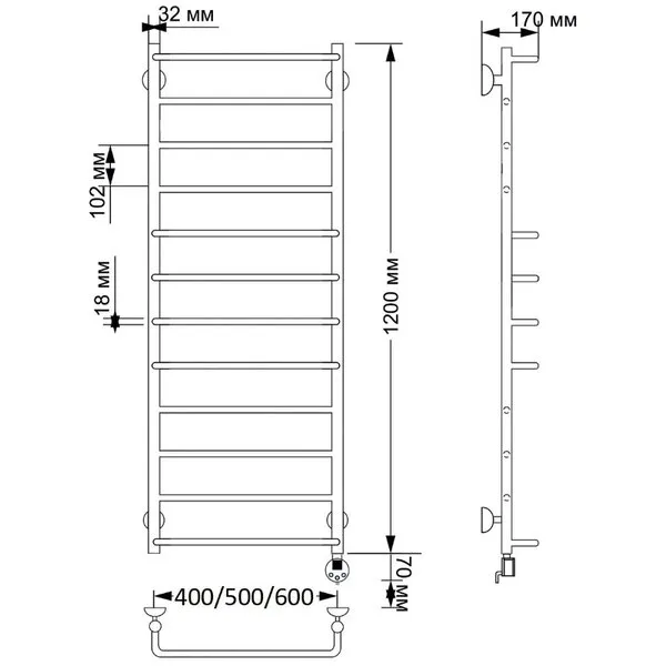 Электрический полотенцесушитель имеет выключатель на корпусе, встроенный терморегулятор, функцию отключения при нагреве для экономии энергии.