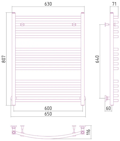 Межосевое расстояние: - нижнее подключение X (мм) 600 Внешние габариты (высота х ширина х глубина) (мм) 807 х 650 х 116 Подключение Универсальное Материал Нержавеющая сталь AISI 304 L (04X18H10) Площадь помещения (м2) 8.3 Объем помещения (м3) 20.7 Теплоотдача (Qвт) 829 Рабочее давление от 3 до 15 атм Давление испытаний 60 атм Температура теплоносителя до 105°С Масса (кг) 10.82 Объем (м3) 0.042